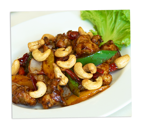 Diced chicken cooked in garlic soy sauce with dry red chilli and cashew nut