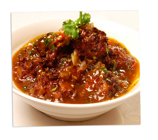 Chili hot with musky flavor of dark soy served garnished with chopped coriander and crispy noodles.